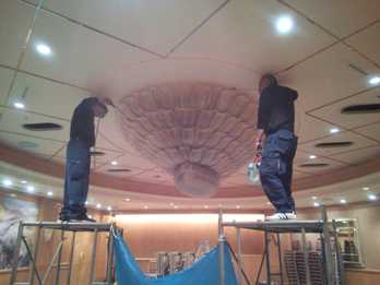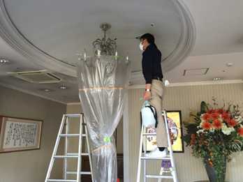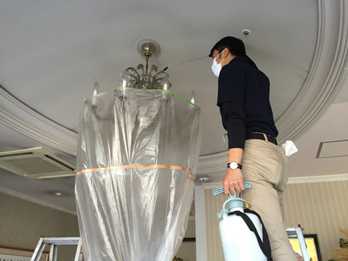 床の保護の為、養生をします。場合によりシャンデリアの周りに養生をします。