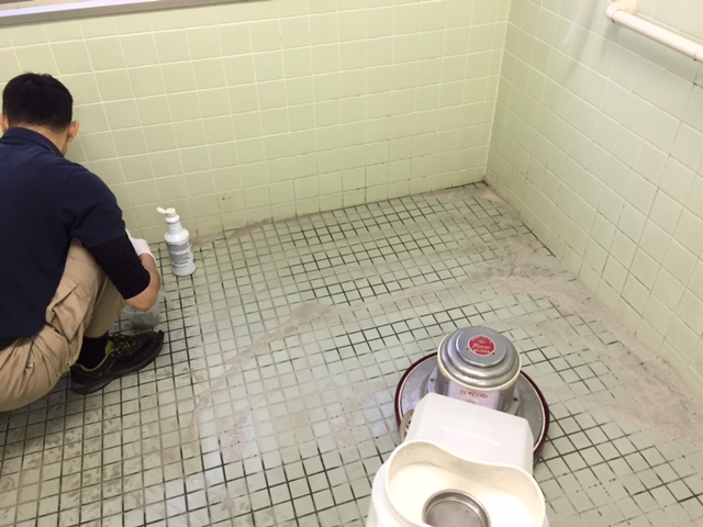床のタイルは酸性のケミカルとコンパウンドを併用し、四隅やパイプ周りの細かいところは手作業で仕上げました。
