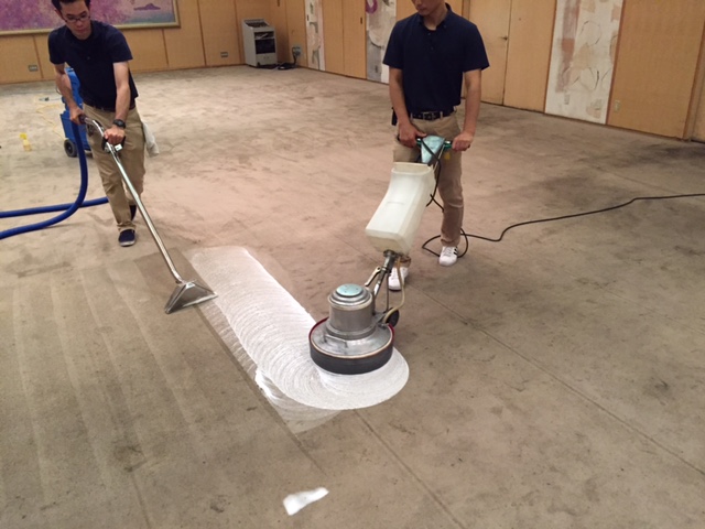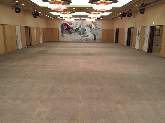今回はメインの宴会場「カメリア」と2階の廊下を作業しました。