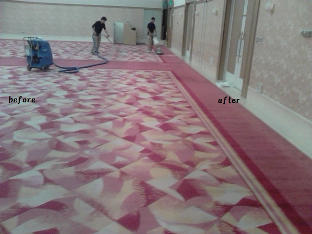 待合、通路のタイルカーペットはシャンプークリーニング+エキストラクション(すすぎ洗い)をおこないました。