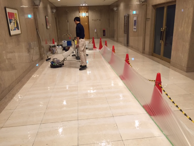 大分市の海沿い田ノ浦ビーチの先に立つ結婚式場で大理石研磨光沢再生の施工しました。