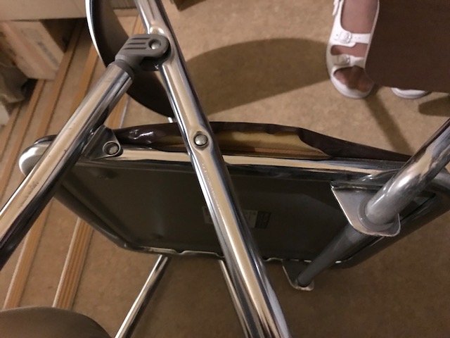 パイプ椅子の横が剥がれ、開いてしまっていました。部分的な補修では収まらないので全面張替えです。