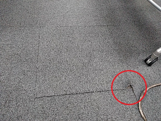 もともとタイルカーペットの施工には張替えが可能なように脱着可能なボンドを使うのですが、経年劣化で弱くなってくるとカーペットがずれやすくなってきます。