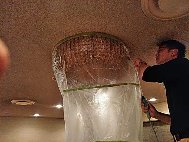 「天井に吊るしてあるだけなのに汚れるの?」と思われるかもしれませんが、家庭の照明でも年月がたてばホコリが積もってくるようにホテル、式場のシャンデリアもホコリが付着してきます。