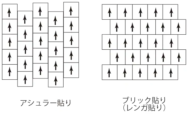 レンガ貼りはレンガのように横にずらして敷く貼り方です。ずらしたラインで帯状の模様が現れます。